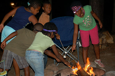When the dark settled in, we whipped up dinner (grilled veggies, salmon, chicken, and potatoes the first night; hamburgers, hot dogs, chicken sausage, and grilled corn the second) on the campfires, and then watched the kids gorge on S’mores while we played “When I Go to the Moon.” We followed that up with a raucous round of campfire singing, black people style, which means we were crooning Teena Marie, Chaka Khan, Rick James, Run DMC, and Sugar Hill Gang songs at the top of our lungs (the volume of said sing-alongs was wholly controlled by various adult elixirs).